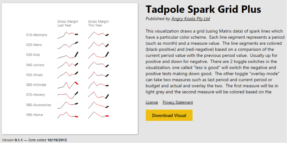 But the thing that impressed me most is that they took the source code for all these visualizations and put it in GitHub. This means that you can derive from existing visuals and extend them, or build your own. Don’t like how the charts work? Change them by creating new versions that work the way that you want them to.