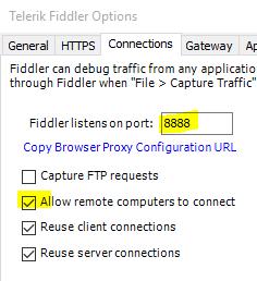 Go to the “Connections” tab and make note of the port number Fiddler is listening on (default 8888) and make sure “Allow remote computers to connect”